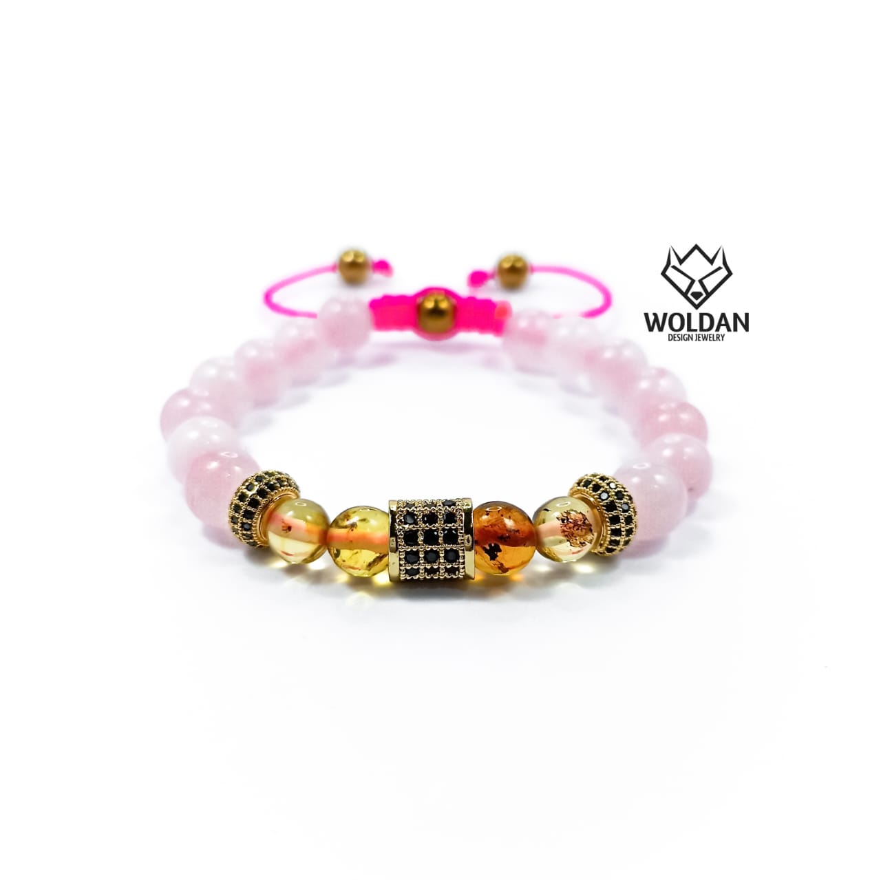 Ámbar de Chiapas, cuarzo rosa, piedra hematita dorada; dije y separadores con incrustaciones de zirconias.