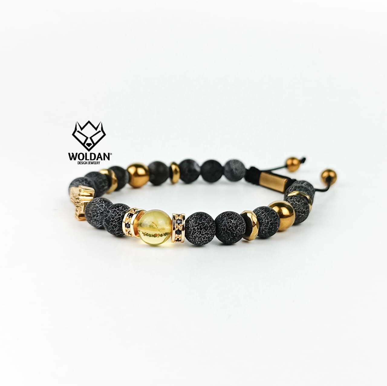 Ámbar, pasta de piedra ágata craquelada 8mm, hematita dorada, y dijes chapa de oro con incrustes de zirconias. Placa de acero inoxidable con logotipo de la marca