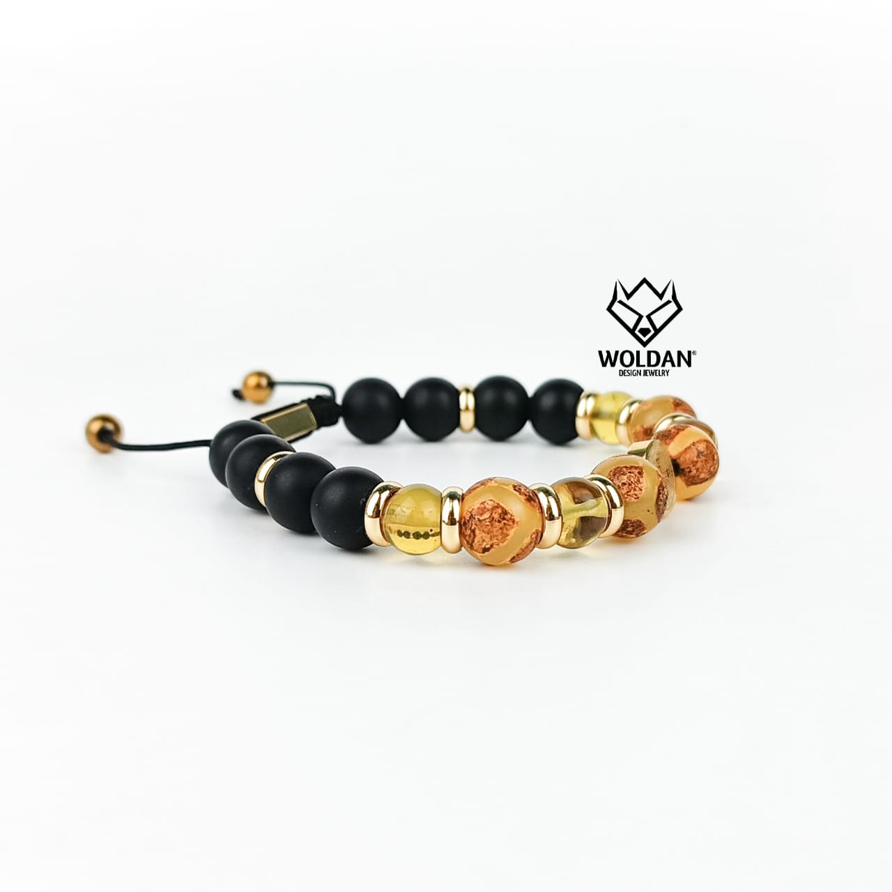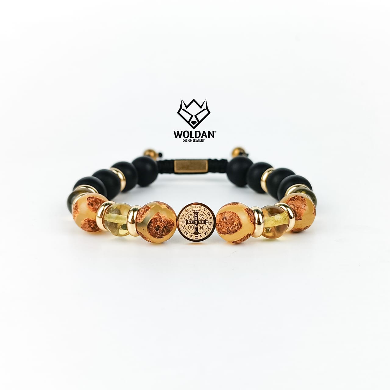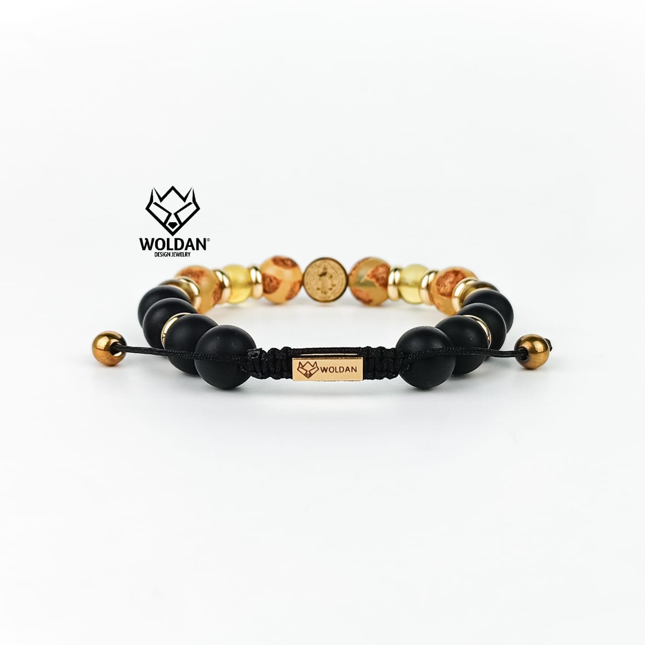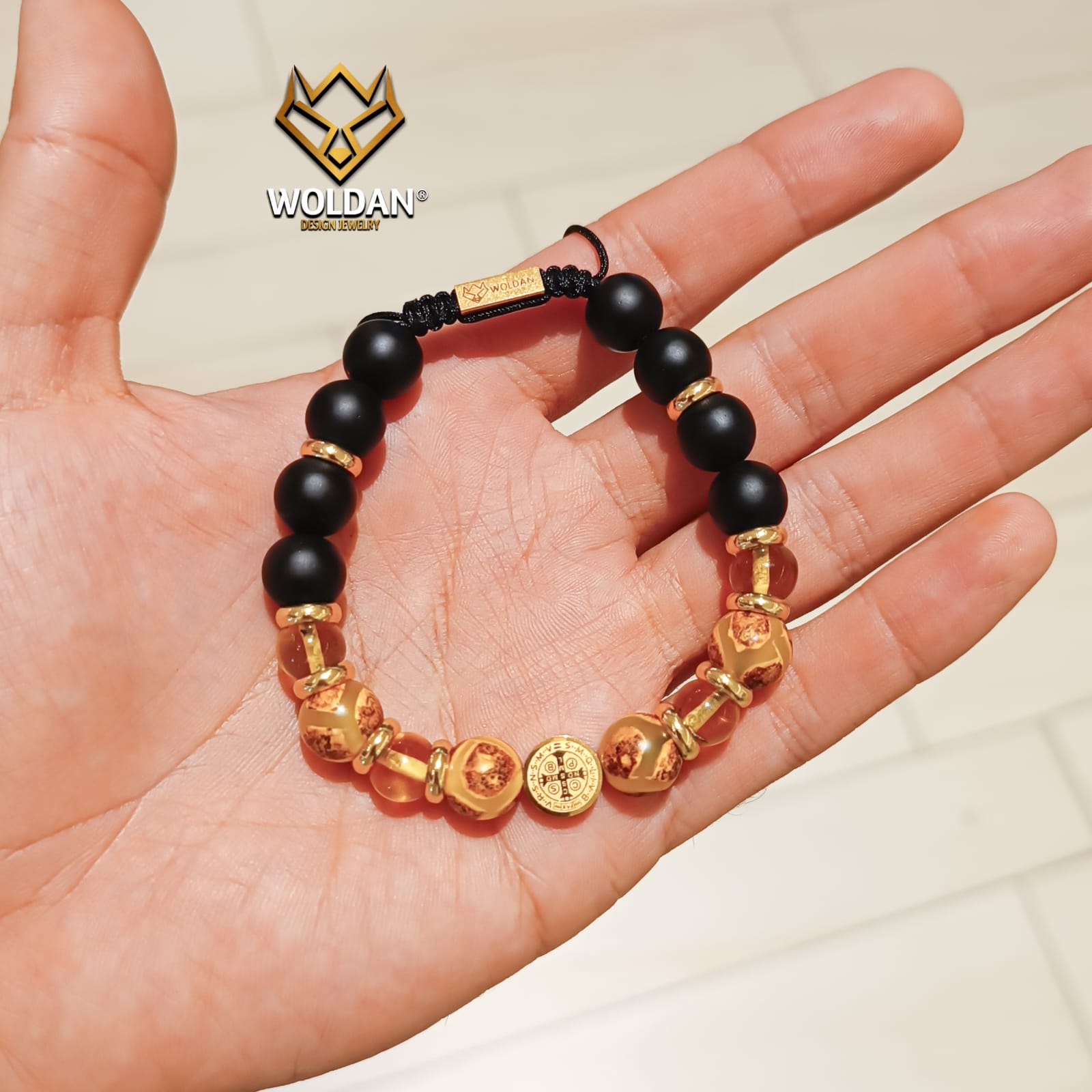 Materiales: Piedra ágata madera 10mm, cuarzo ónix negro matte 10mm, ámbar esfera, separadores y dije de san benito de acero inoxidable 10mm; placa con la marca WOLDAN de acero inoxidable