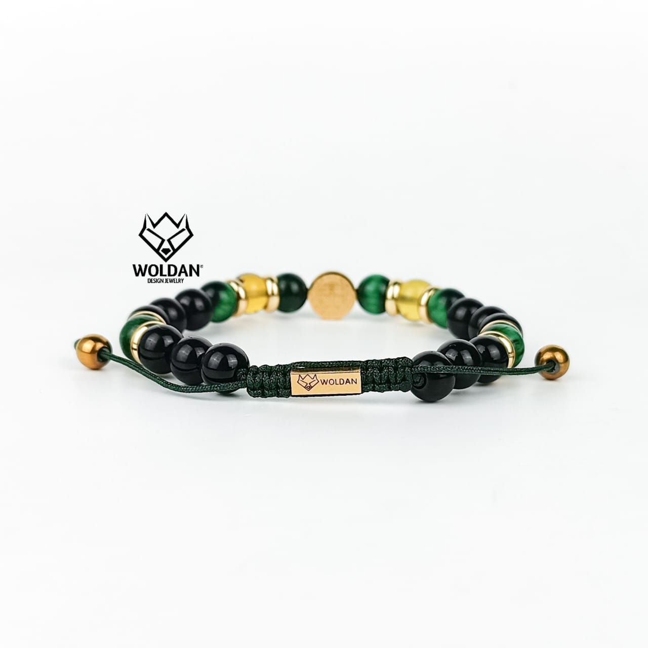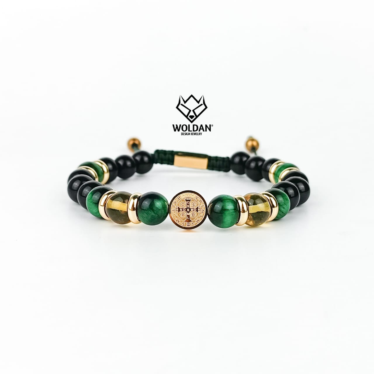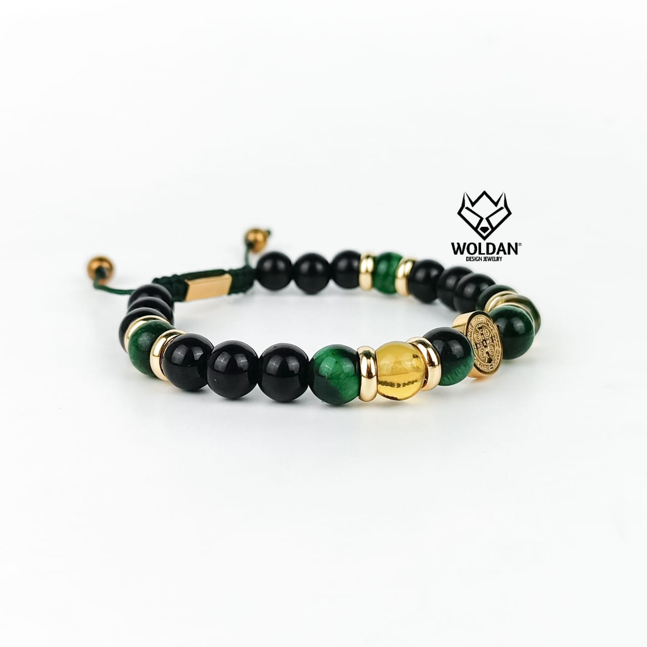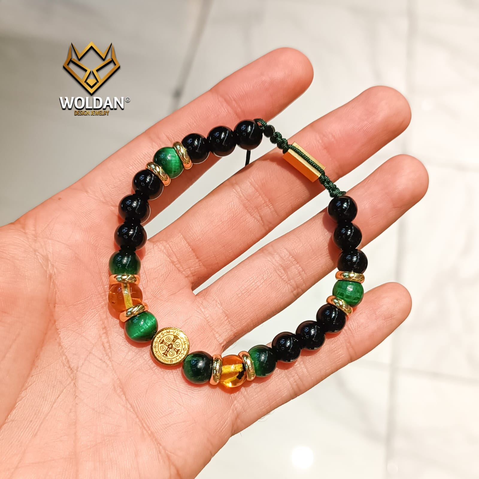 Materiales: Cuarzo ojo de tigre verde 8mm, esferas de ámbar, cuarzo ónix negro, separadores y dije de san benito de acero inoxidable 10mm; placa con la marca WOLDAN de acero inoxidable