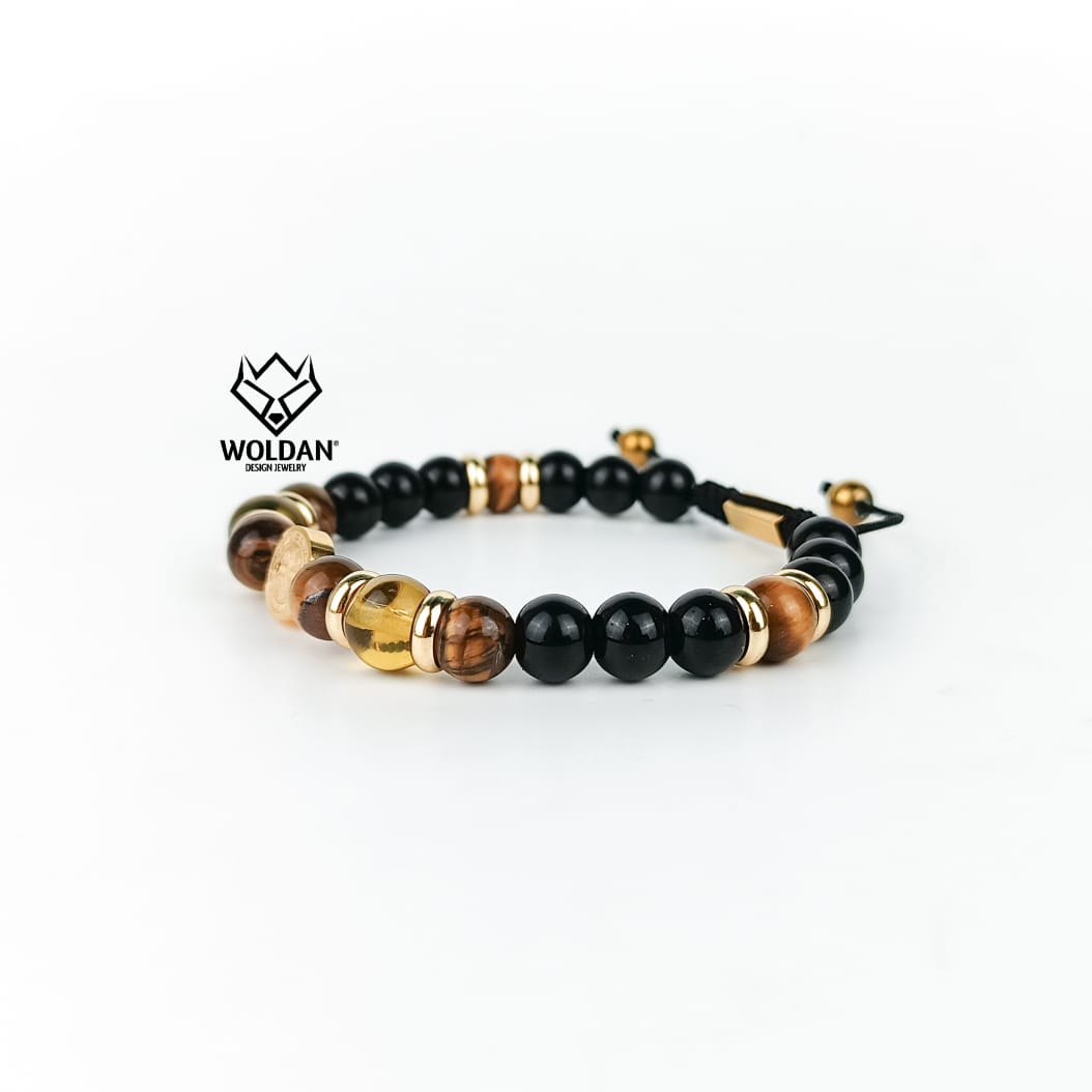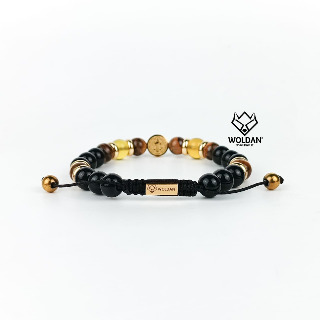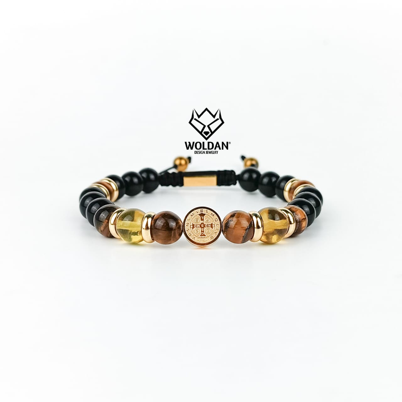 Materiales: Cuarzo ojo de tigre café 8mm, esferas de ámbar, cuarzo ónix negro, separadores y dije de san benito de acero inoxidable 10mm; placa con la marca WOLDAN de acero inoxidable