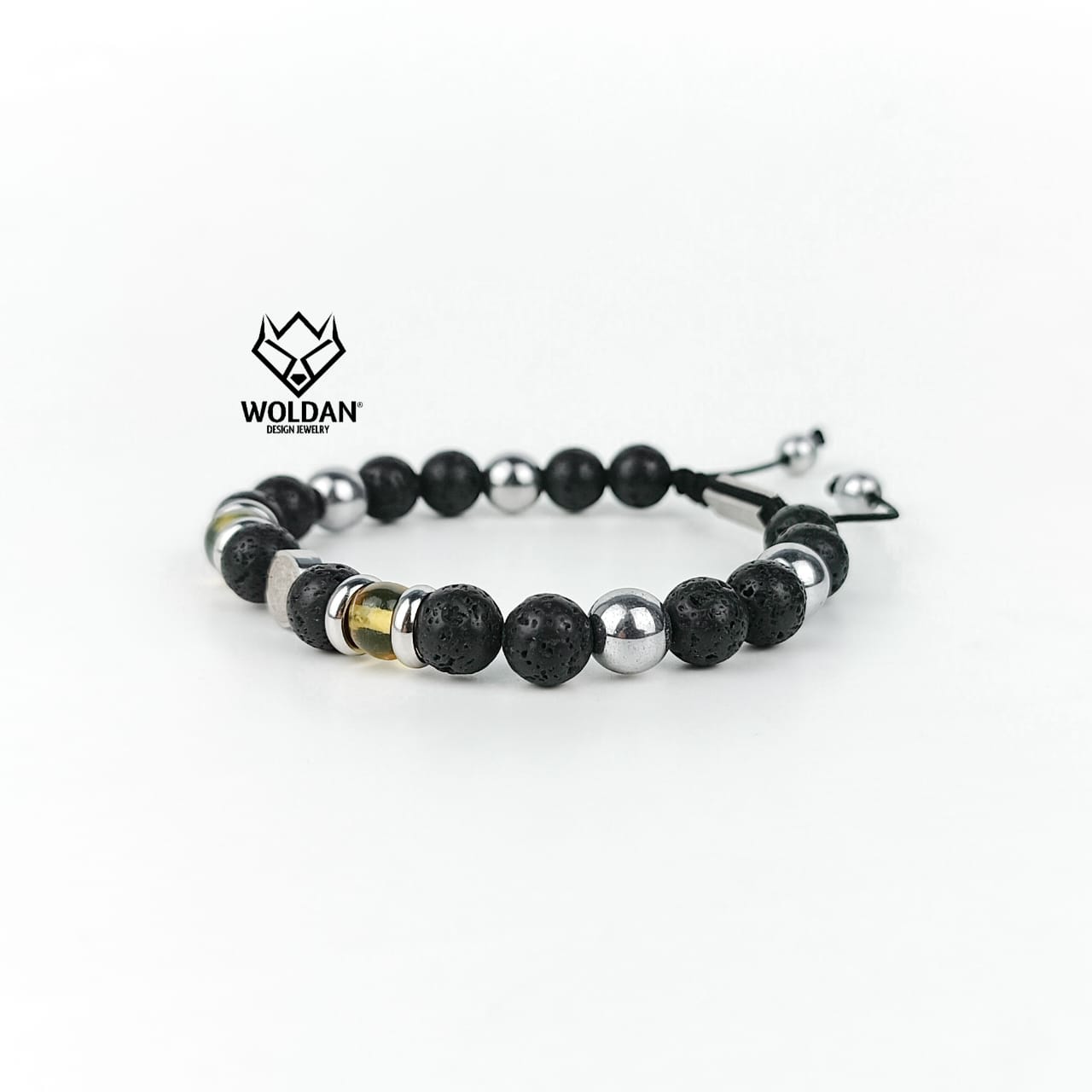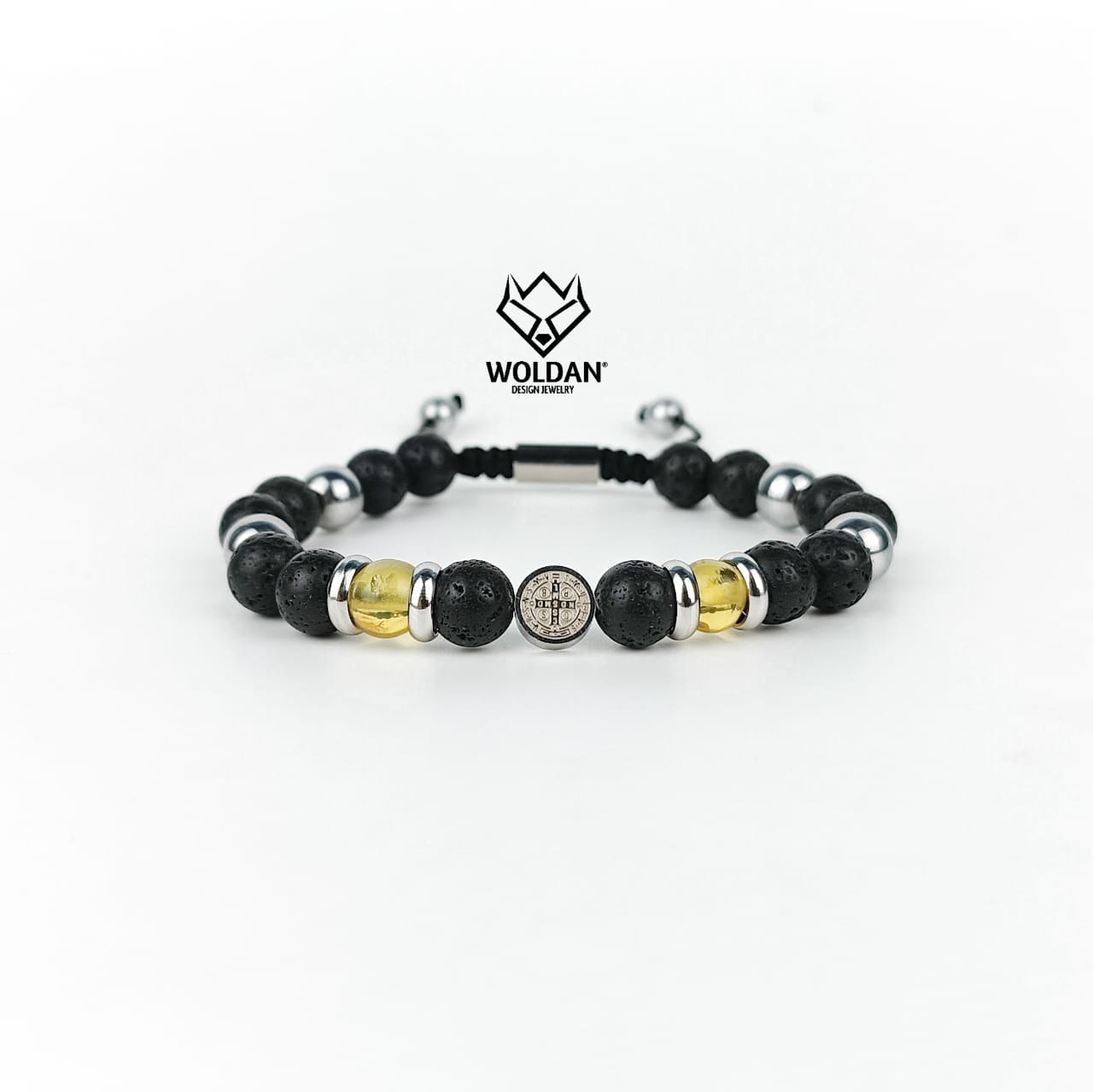 Materiales: Piedra volcánica de 8mm, piedra hematita plata, ámbar esferica; dije y separadores de san benito de acero inoxidable 8mm; placa con la marca WOLDAN de acero inoxidable