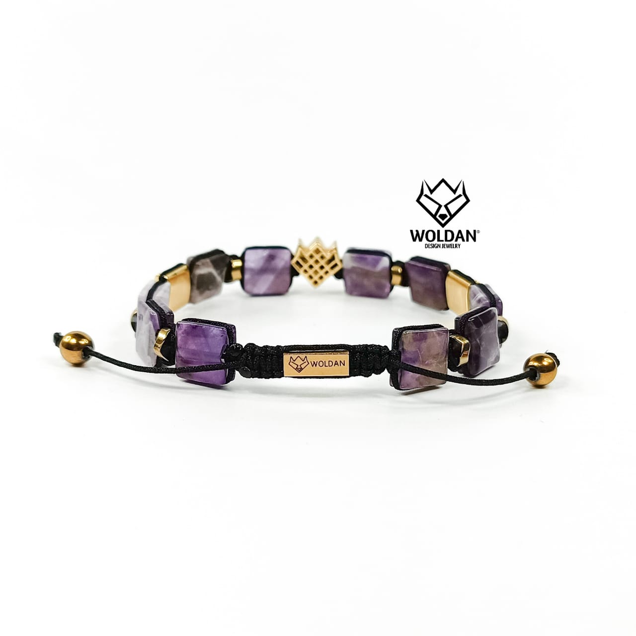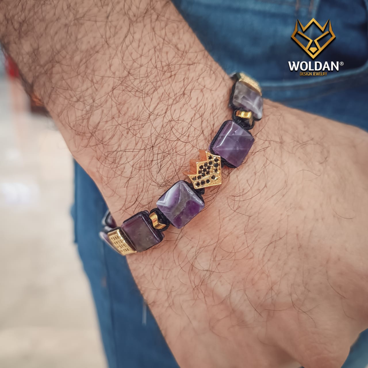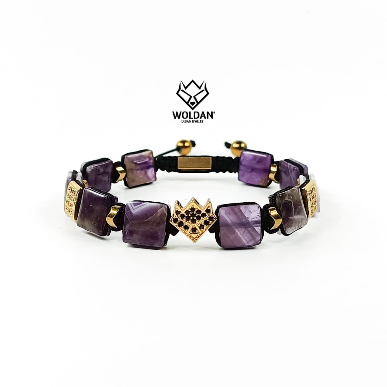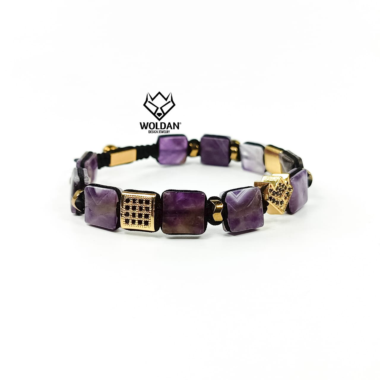 Materiales: Cuarzo amatista de 10mm, piedra hematita dorada ondulada; dijes chapa de oro con incrustes de zirconias.