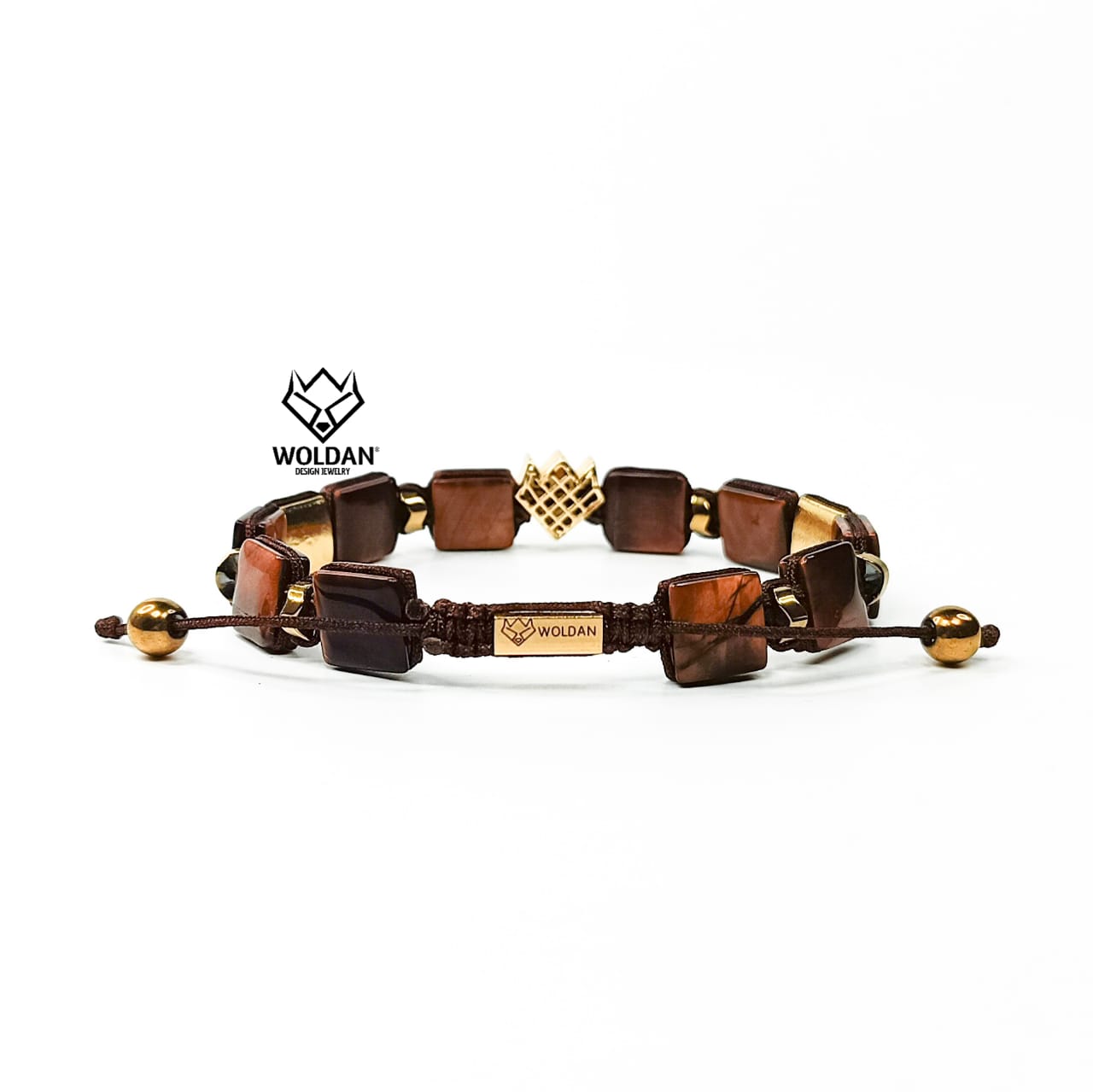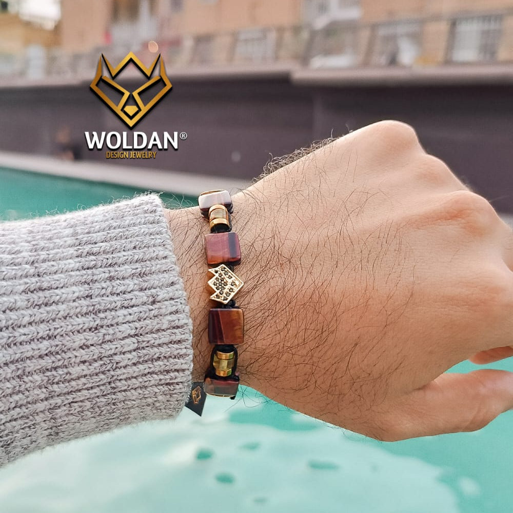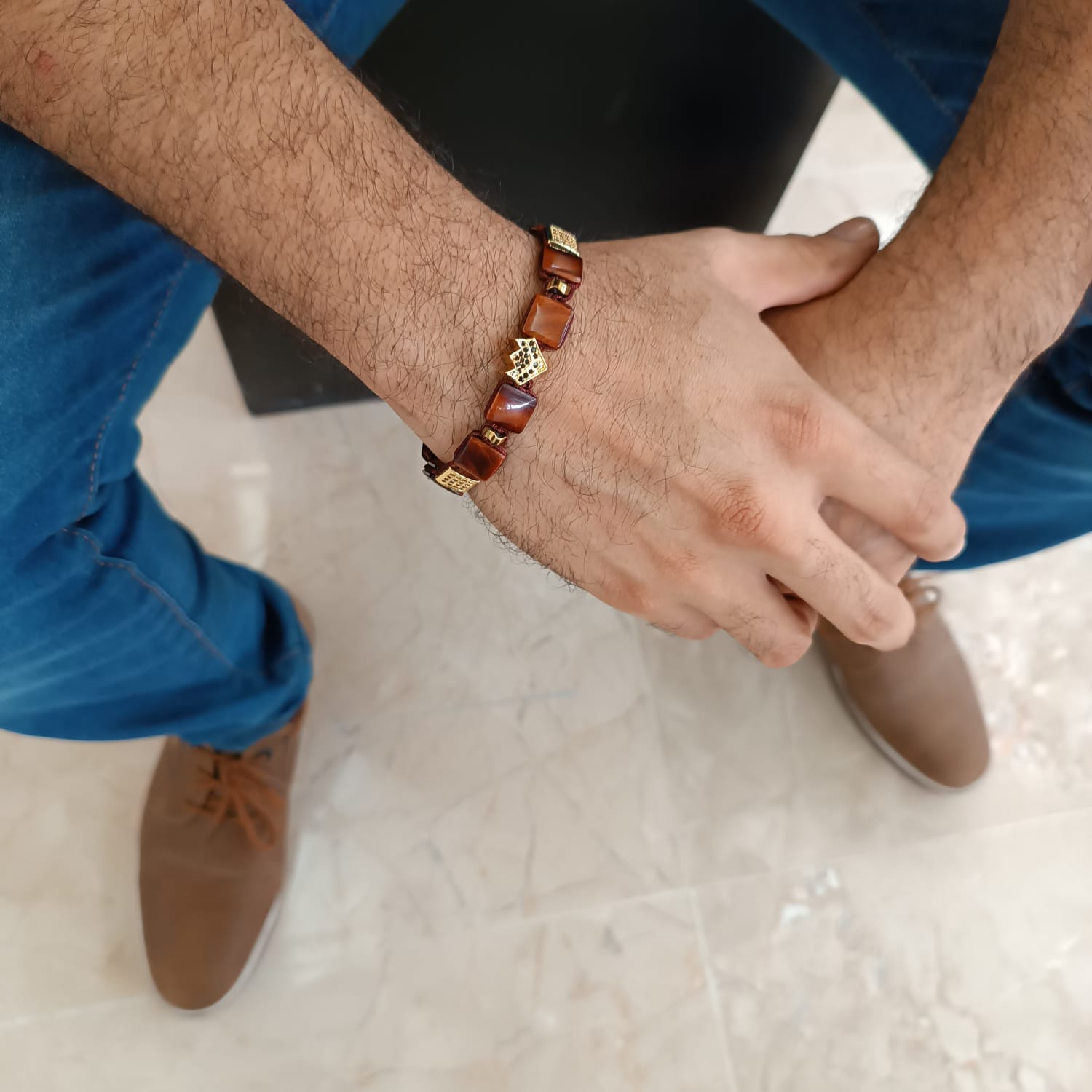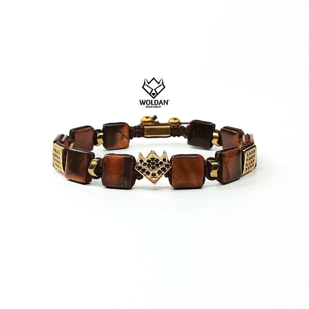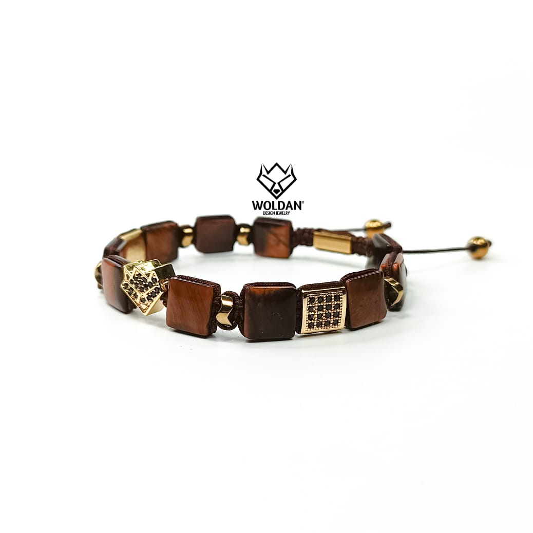 Materiales: Piedra ojo de buey 10mm, piedra hematita dorada ondulada; dijes chapa de oro con incrustes de zirconias.